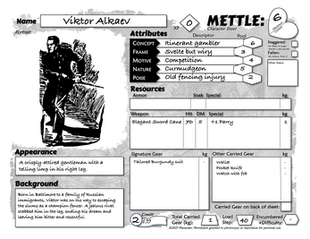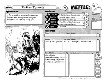 METTLE Core is a compact set of powerful and adaptable rules to help you run or make your own Role-Playing Game (RPG). This core set is geared towards heroic tales of courage, mystery, and intrigue. Detective stories, crime dramas, B-movie mayhem, daring rescues, tense exploration, gritty post-apocalyptic survival, wild-west gunfights, Nazi-clobbering, low fantasy, and grounded science fiction. This focus on so-called “mundane” heroics caters to an underserved style of play and provides a general base to the system. Upcoming games may indulge settings reliant on magic, superpowers, or miracles of science.
